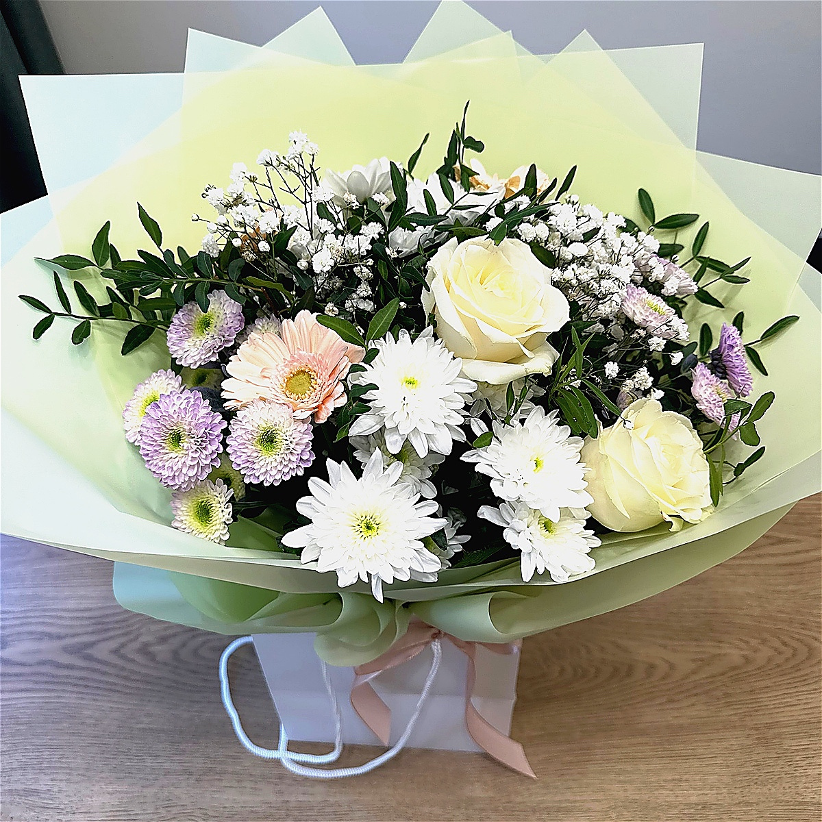 Elegantly wrapped, in water in a bag/box