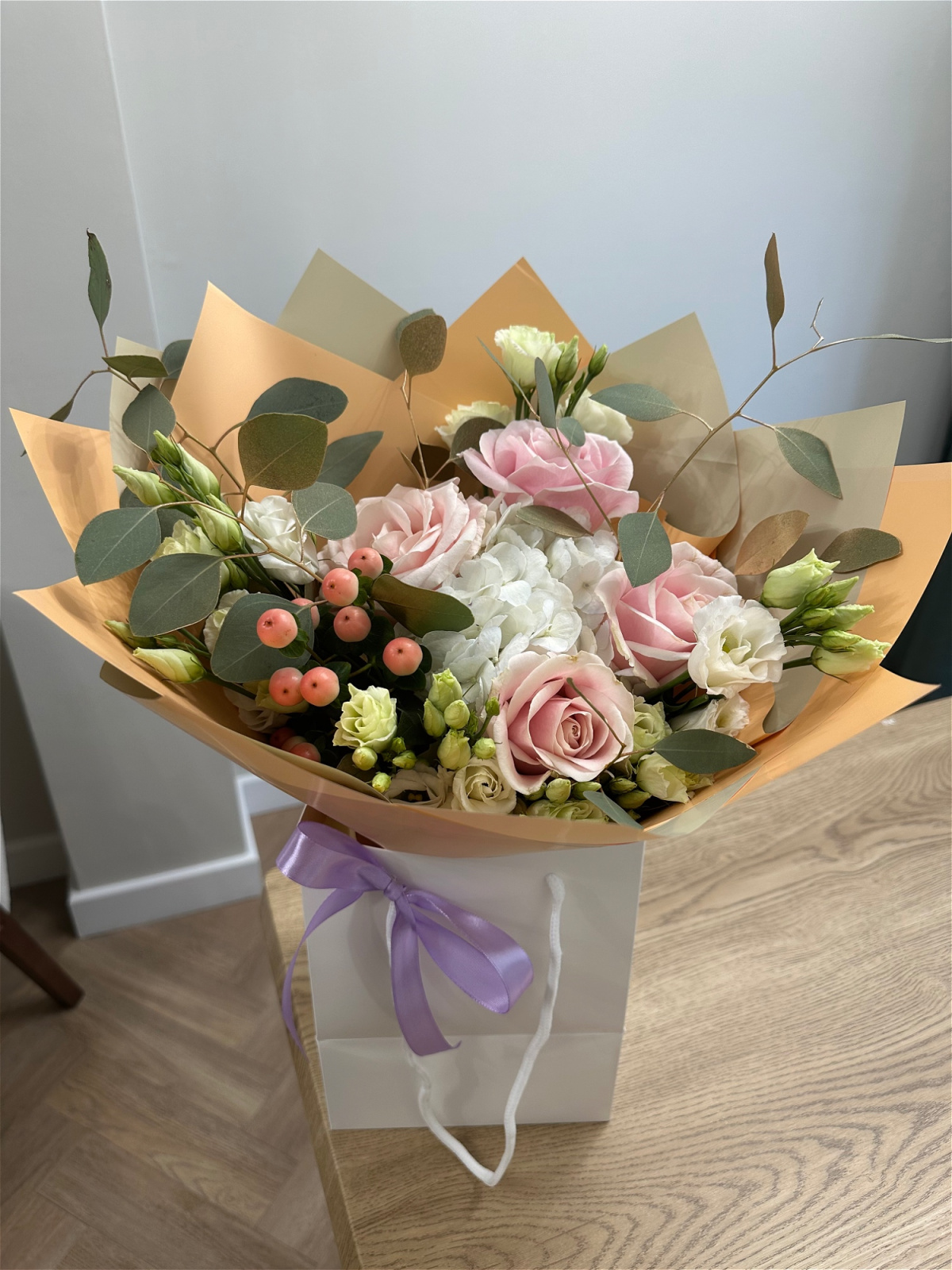Elegantly wrapped, in water in a bag/box